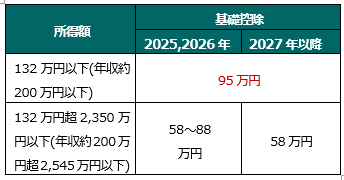 基礎控除がすべての納税者で10万円以上引き上げられ、最大で95万円まで控除額が増えました。