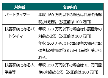 基礎控除の改正に伴い、従来103万円以下だった一般の扶養控除対象の年収上限が、123万円に引き上げられました。